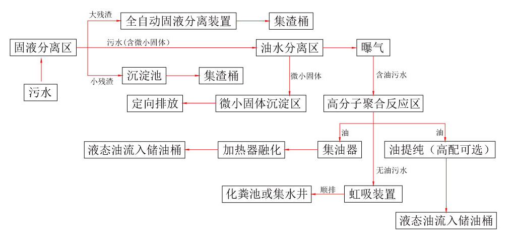 ① 三栖分离:油、水、渣三栖分离,整个设备是由固液分离装置、油水分离装置、污水提升装置三部分组成。模块化设计,外观优美,安装方便,维修简单,具有可 升级能力。