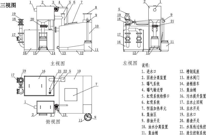 ①三栖分离:油水渣三栖分离,整个设备是由固液分离装置,隔油仓,污水提升仓三部分构成,模块化设计,外观美观,安装方便,维修简单,具有可升级潜力。